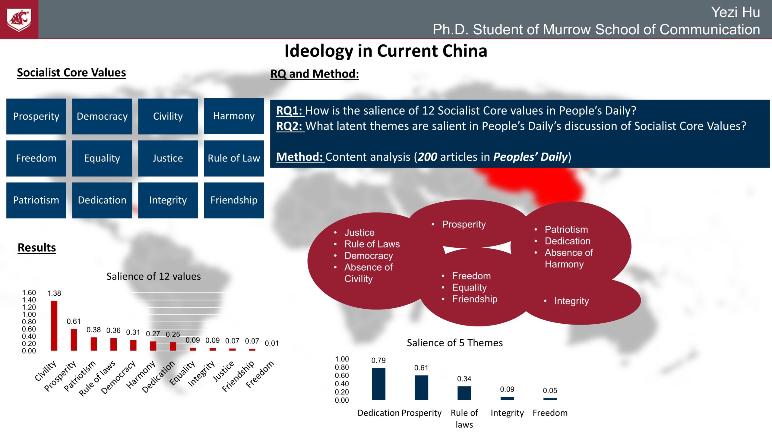 Since people in China stopped believing communism after the cold war, new values have been introduced to the ideological system to support the regime’s legitimacy, making the current ideology in China complex and perplexing. This study performed media content analysis and factor analysis to solve the ideological puzzles of current China, examining the salience of 12 Socialist Core Values that the Chinese Communist Party is promoting in Chinese media. It confirmed the existence of the ideological hierarchy and the 5 latent themes under the discussion of the values in People’s Daily. Since ideology is the foundation of a country’s economy and politics, this study helps the world more understand the logic behind Chinese policies and behaviors.